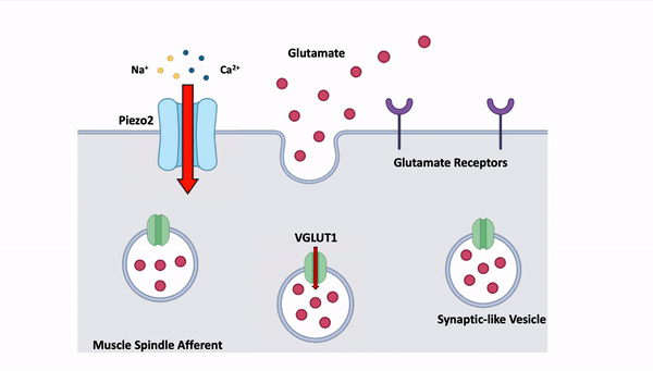 Synaptic-like vesicles containing glutamate are found within muscle spindle afferent peripheral nerve endings. These vesicles are released in an activity dependent manner, with an increase in vesicle release following multiple stretches or high frequency vibration. This glutamate is thought to increase afferent sensitivity to stretch as exogenous glutamate can increase whole nerve firing rate during stretch. However, the effect on individual afferents has not been determined. We are characterizing the precise role of glutamate in the functioning of muscle spindle afferents, the sensory neurons responsible for proprioception or the ability to sense one’s body position. Currently, we are directly recording afferent activity and stretch response in muscles from both wild-type mice and those lacking a copy of the vesicular glutamate transporter 1 (VGLUT1) gene. Since the VGLUT1 gene encodes for a protein needed for glutamate packaging and release, we expect to see altered or aberrant stretch response in the afferents of mice that lack a single copy of this gene. Through direct recordings we hope to deepen our understanding of the role of glutamate in proprioception.