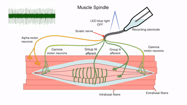 We are currently developing an optogenetics technique to study the gamma motor neurons that innervate the muscle spindle and are vital for motor control. The length of the muscle spindle is controlled by gamma motor neurons innervating the intrafusal muscle fibers of the spindle. However, it has been challenging to study the gamma motor neurons since it is hard to specifically stimulate the small gamma but not the larger alpha motor neurons that control the force generating extrafusal fibers using electrical stimulation. We express the blue light activated channelrhodopsin2 (ChR2) in ChAT positive motor neurons and use lower optical intensities of light to recruit the small gamma motor neurons first. We plan to use this technique to study gamma motor neuron function in vitro. This tool will also allow us to assay intrafusal fiber function in disease states.